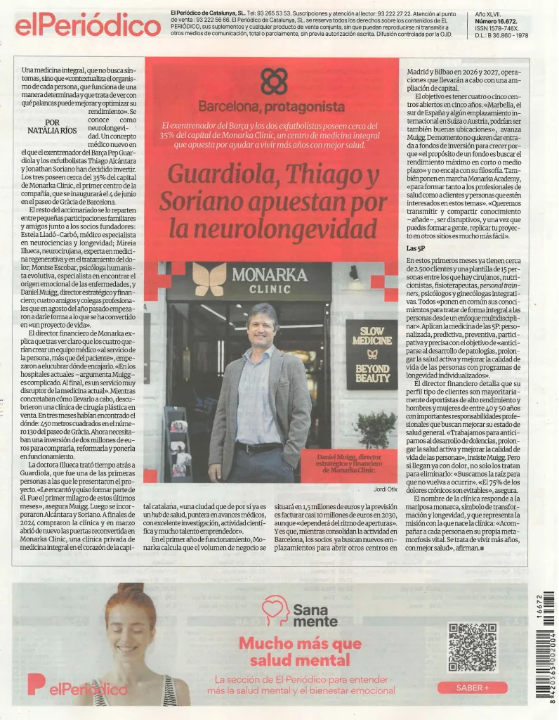 Pep Guardiola joins an innovative health project in his hometown: the Monarka Clinic in Barcelona. This 450 m² clinic, located on Passeig de Gràcia, specialises in neurolongevity and quality of life for older people. It uses advanced technology and specialises in precision medicine and emotional support.